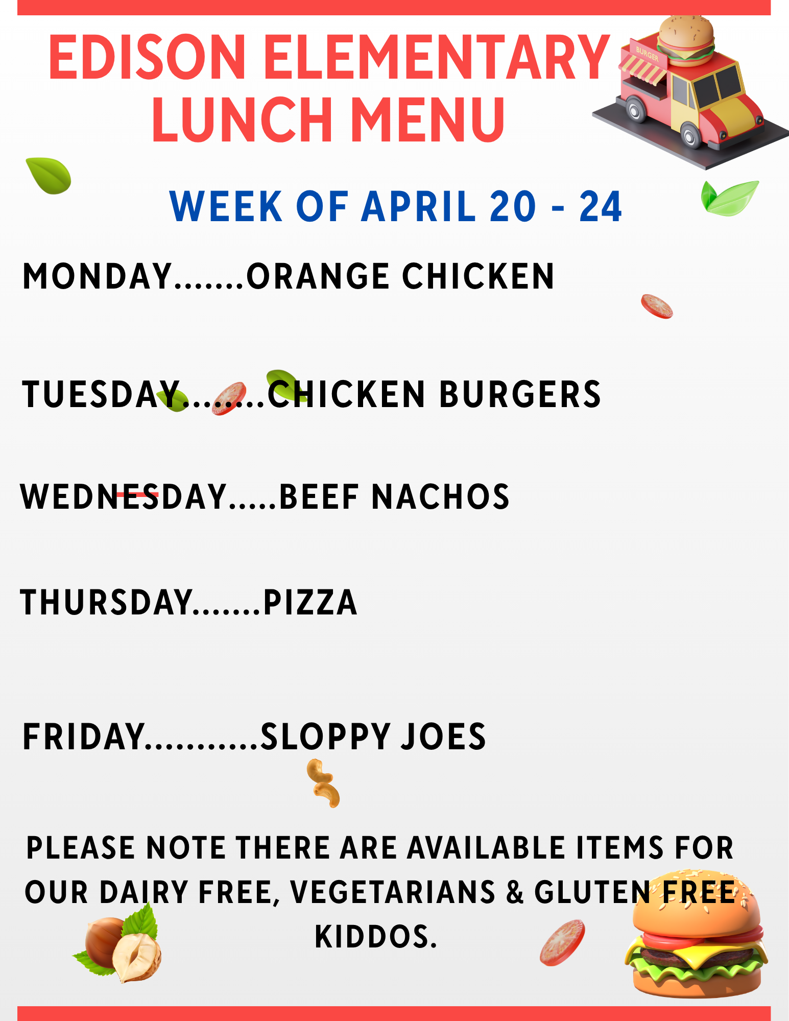 Lunch Menu for the week of April 20-24
